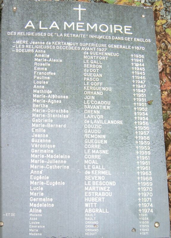 Parlons au passé, car n’ont-elles pas rejoint, à Guiclan (29) chez les Pères de St-Jacques de Haïti leurs sœurs religieuses de La Retraite de l’école avoisinante et cherchons sur cette plaque le nom de la, dernière sœur enterrée à Lannion : Madeleine Abgrall décédée en 1974.